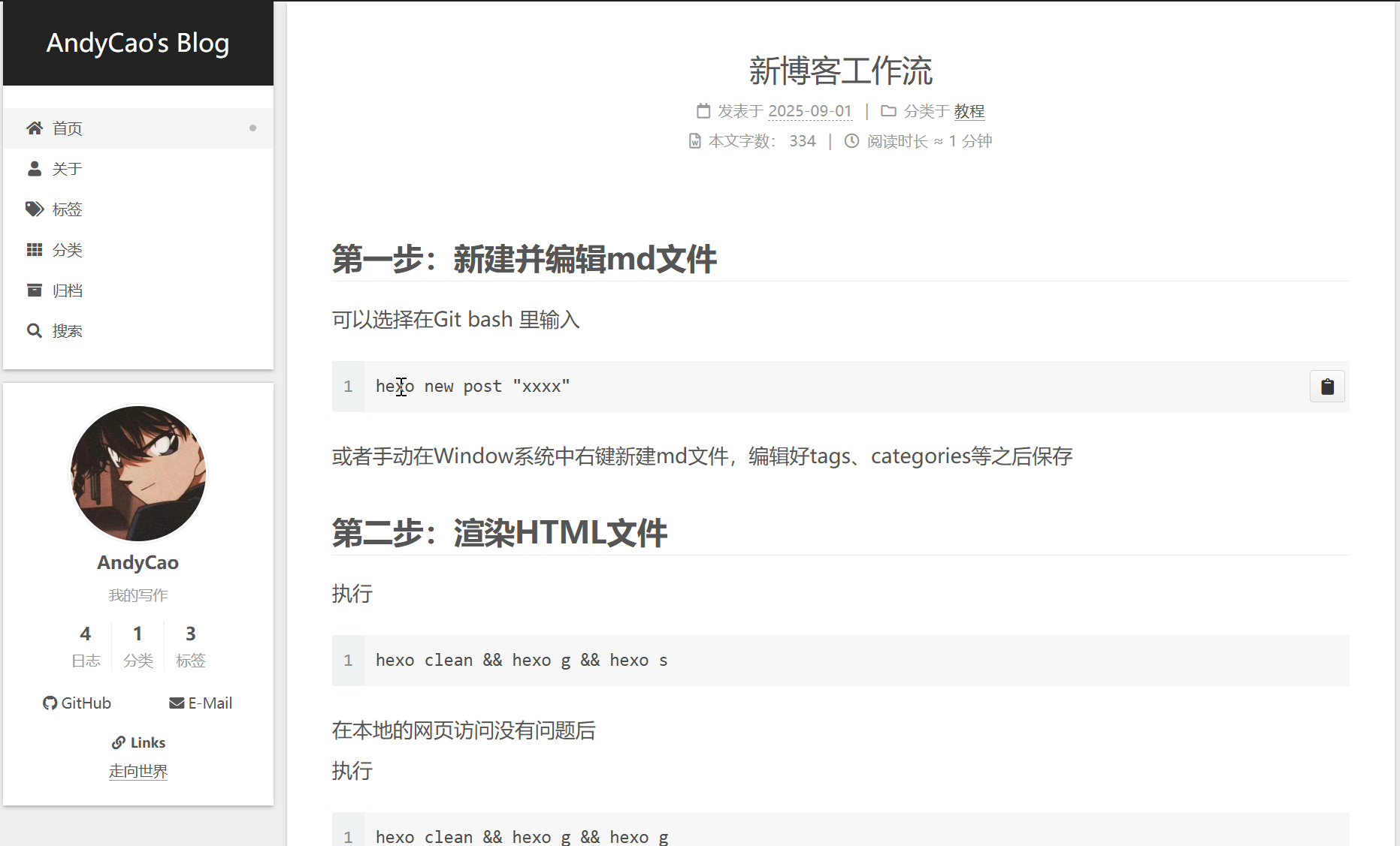 通过在Git bash里面输入命令hexo clean && hexo g && hexo d即可完成网页的更新,具体流程可参考博客的新博客工作流,优化md格式可以参考本博客的Markdown基本语法